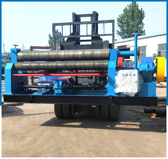 有機械式和液壓式:機械式三輥卷板機分為對稱和非對稱。可將金屬板材卷成圓形、弧形和一定范圍內的錐形工件,其工作原理是通過液壓力、機械力等外力的作用,使工作輥運動,從而使板材壓彎或卷彎成形;根據不同形狀的工作輥的旋轉運動以及位置變化,可以加工出橢圓形件、弧形件、筒形件等零件。適用于卷板厚度在50mm以上的大型卷板機,兩下輥下部增加了一排固定托輥,縮短兩下輥跨距,從而提高卷制工件精度及機器整體性能。